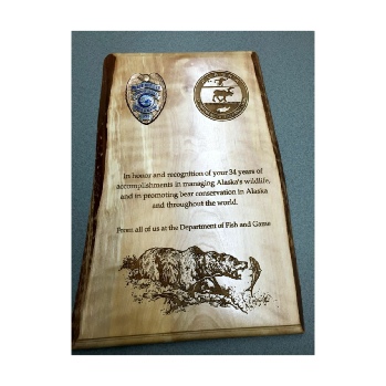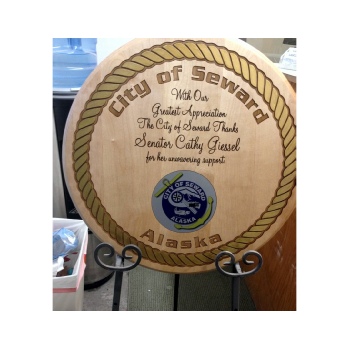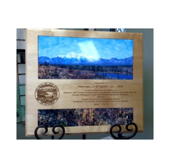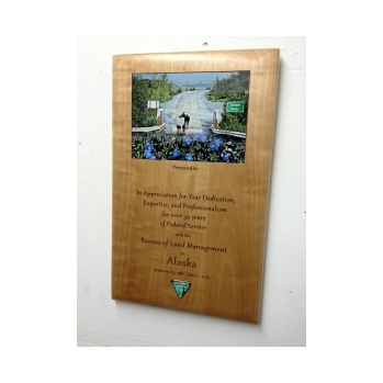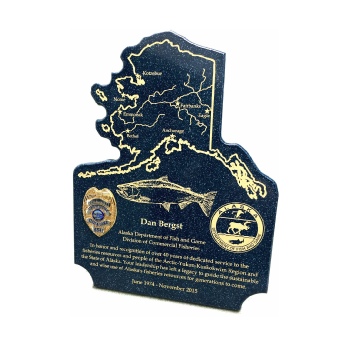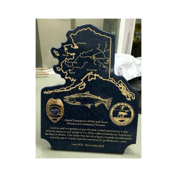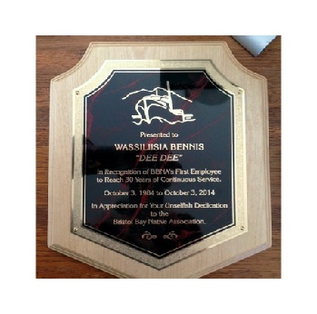 We produce and have access to a wide variety of Awards for any situation or occasion. Laser engraved birch and other hardwoods are our specialty. We also have different looks in awards such as Corian® plaques for that very special occasion. Our plaques come in all shapes and sizes as well as stock shaped. Most are manufactured right here at our Anchorage factory. We have plaques to fit most budgets and we give discounts for volume. We also engrave elegant marbled metal plates in a variety of colors and styles.